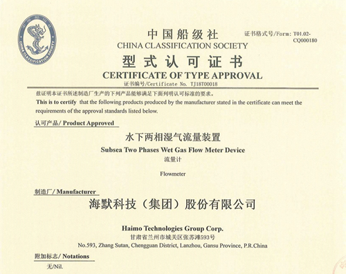 海默科技水下兩相濕氣流量裝置獲中國船級(jí)社(CCS)型式認(rèn)證證書